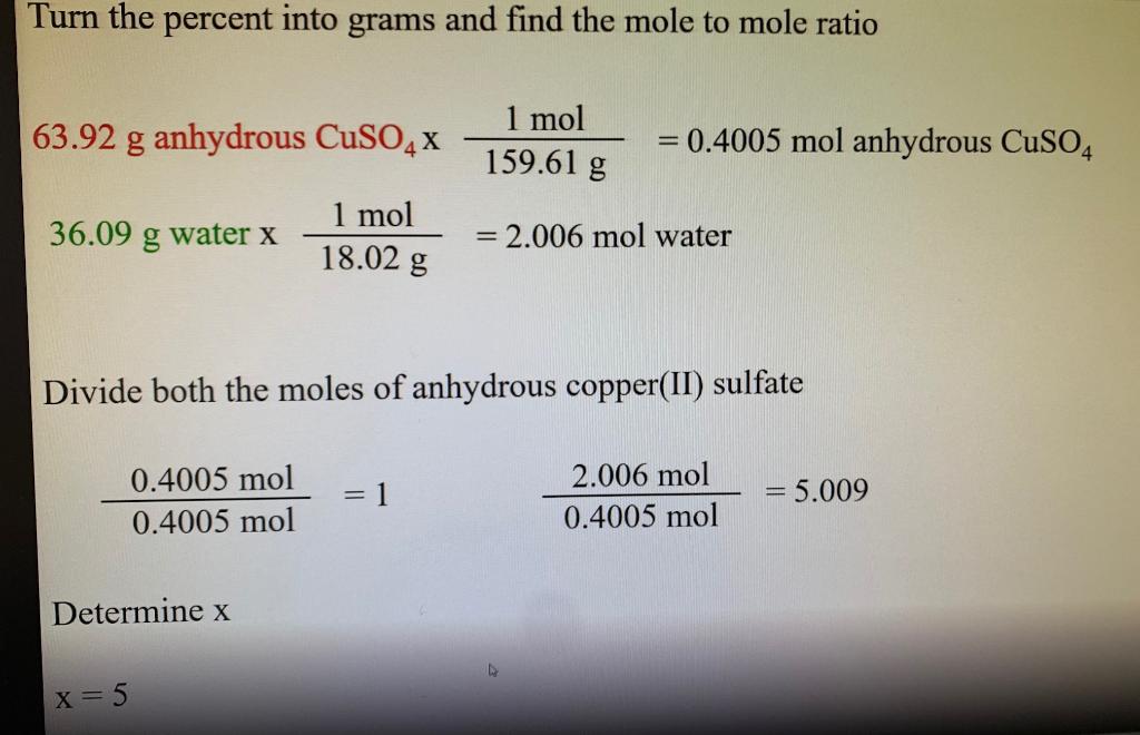 My observation table looks like this. A sample of copper sulfate pentahydrate CuSO45H2O molar mass of CuSO45H2O 24968 gmol contains 3782g of Cu. Hydrated copper sulfate 1000g anhydrous copper sulfate 591g Per the video the next step is to get the molar mass of the anhydrous copper sulfate and determine the number of moles.